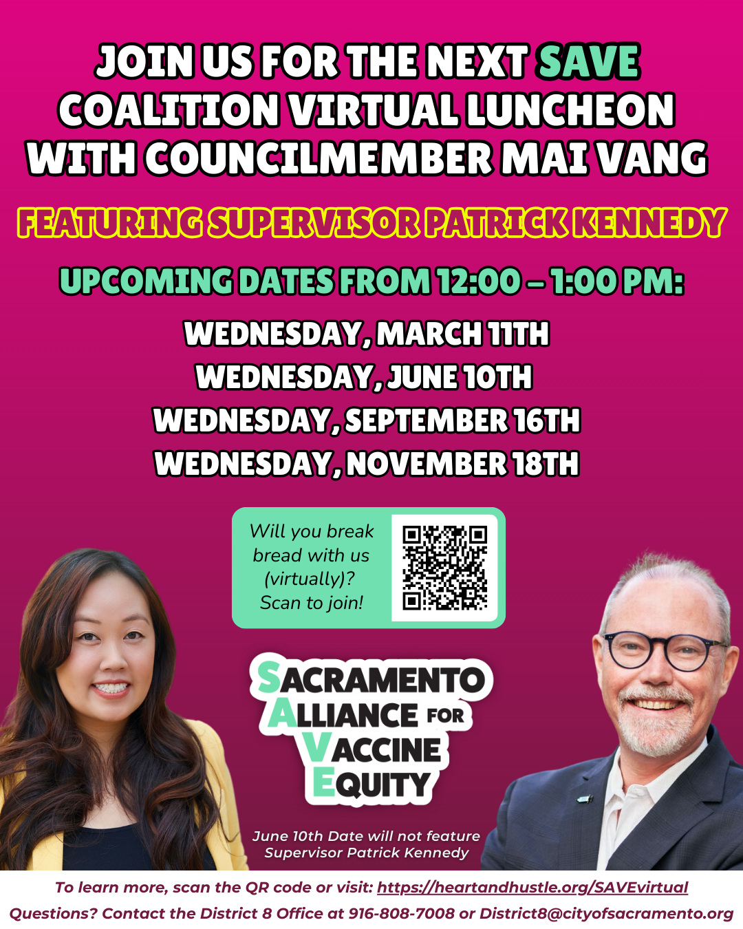Councilmember Mai Vang invites Sacramento-serving organizations to take part in the SAVE Coalition Virtual Luncheons—a quarterly space to provide City and County updates, joined by Supervisor Patrick Kennedy, share key developments, and continue meaningful engagement with South Sacramento–serving community-based organizations.